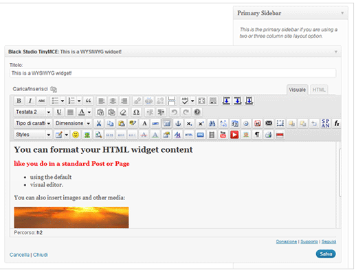 Black Studio TinyMCE Widget je dodatek k zgornjemu, ki pomaga pri pisanju v gradnikih (Widgets).